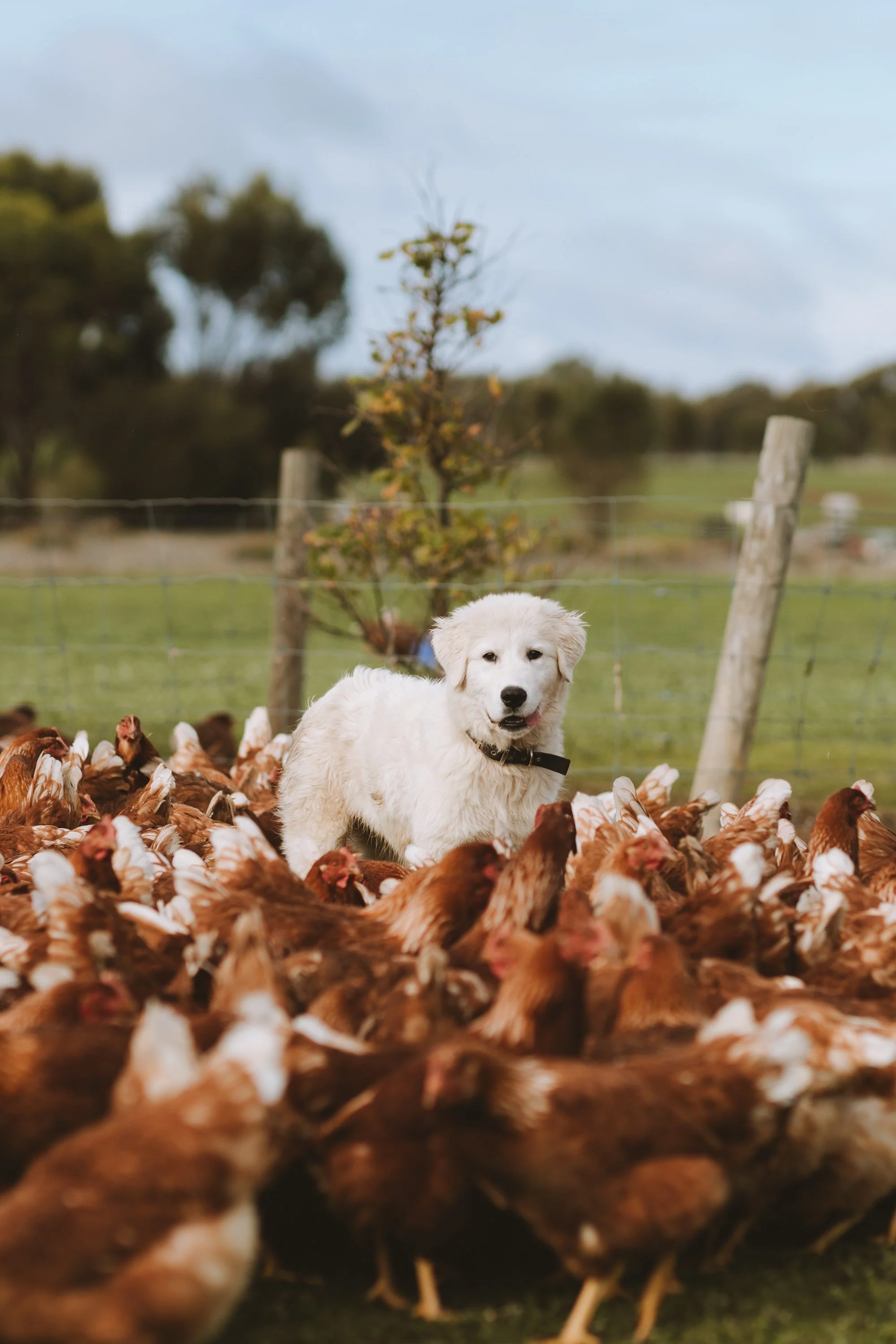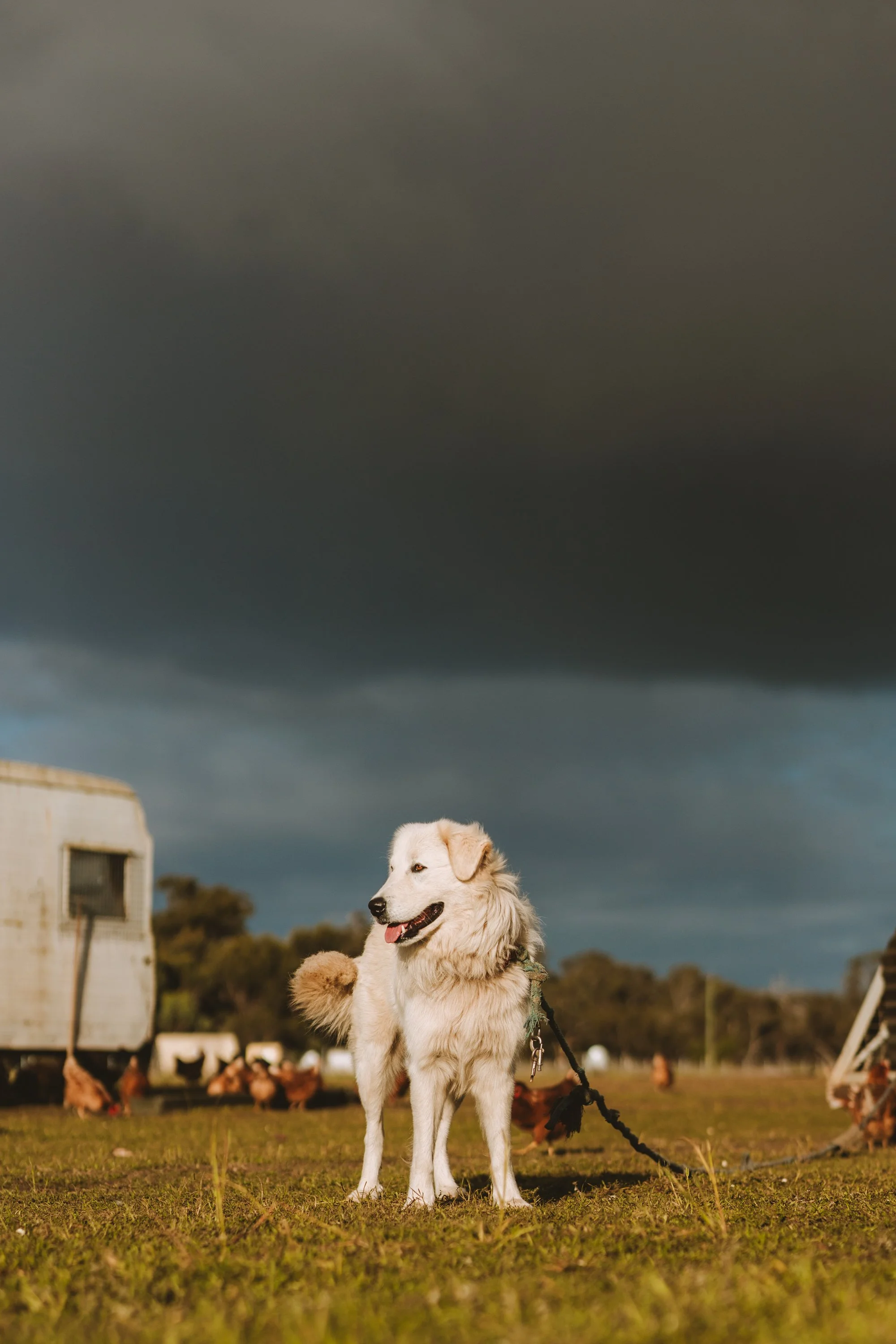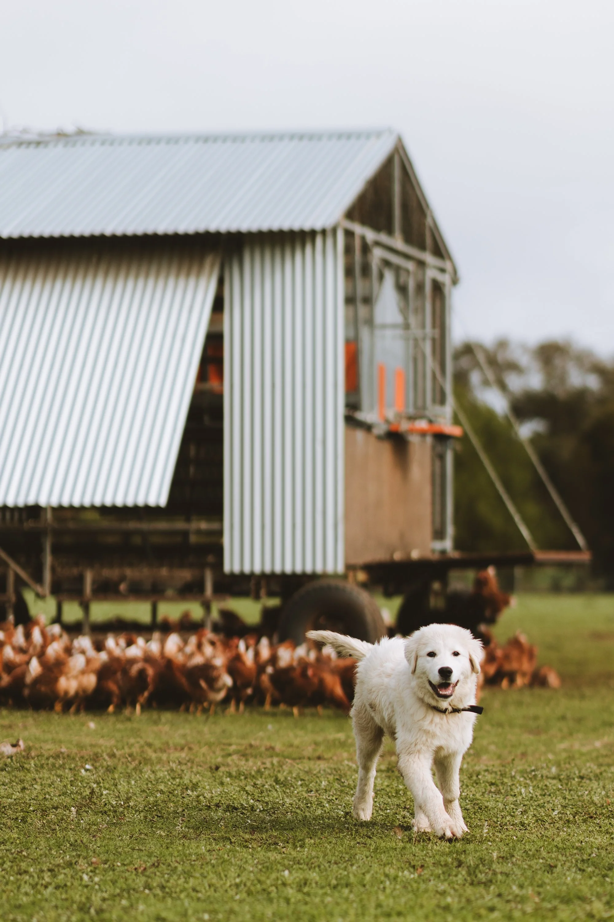 The dogs live outside, in the paddocks, alongside our chickens and keep them safe from predators - especially from foxes an aerial predation! Whilst this may seem strange, these dogs are bred to live outside with whatever animals they are protecting and they love their job! We often find them snoozing under the chicken caravans, surrounded by their chickens (even with the occasional one lying on their back)!